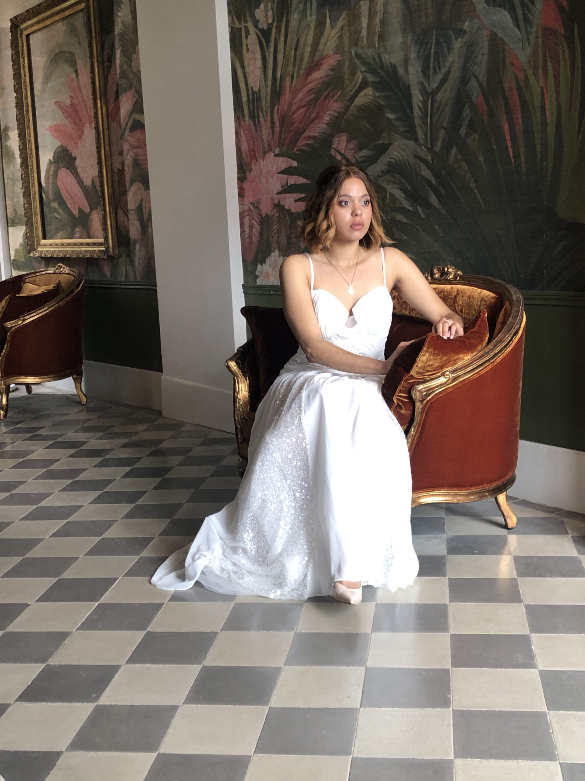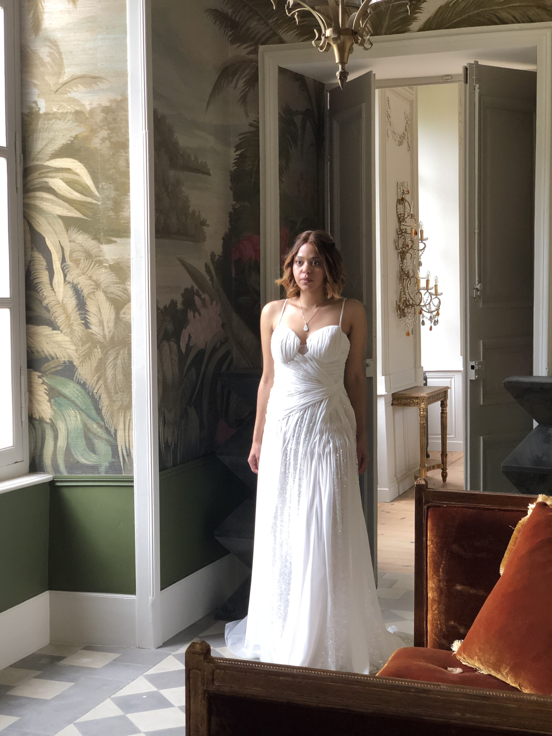 Cette sublime robe en mousseline de soie, ornée de petits sequins, vous éblouira par sa légèreté et son élégance.
